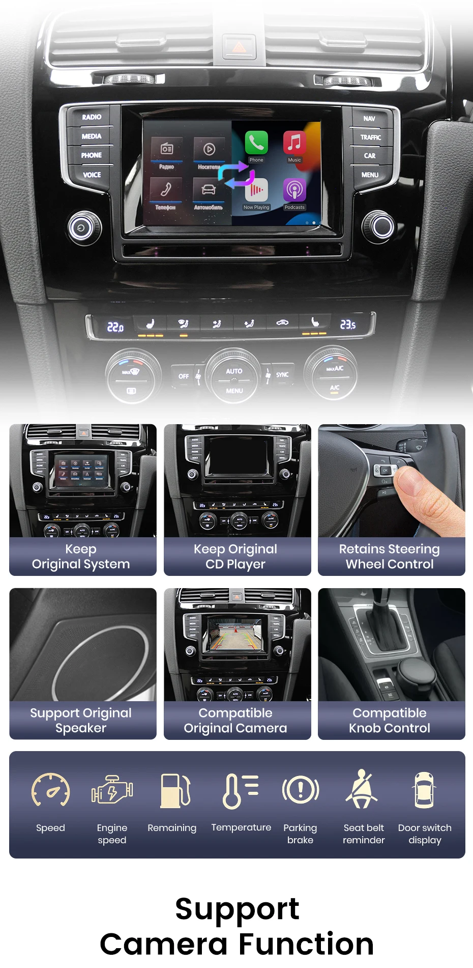 Feature 1: Support CarPlay, Android Auto, Mirror Link, CarLife, USB Flash drive